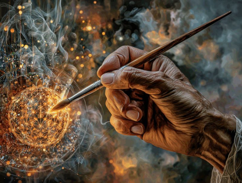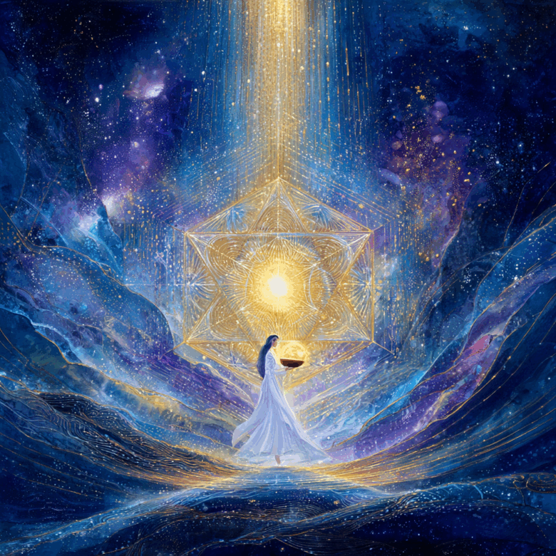 その作品は、観る人の魂に直接語りかけ、眠っていた光を呼び覚まします。まるで宇宙の叡智と繋がり、内なる神性へと還る旅路に誘われるよう。