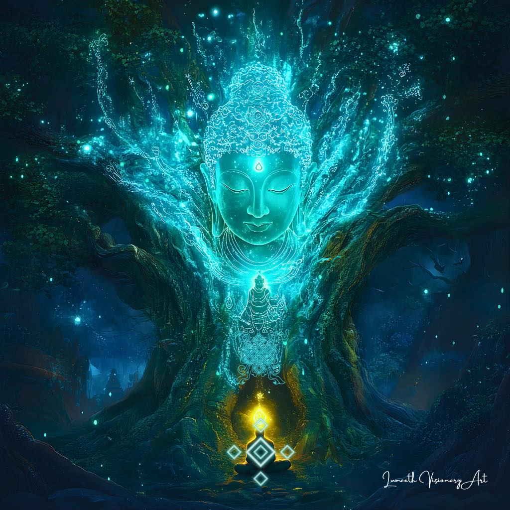 森の静寂の中で現れた光は、意識が重なり合い、ひとつの流れへと戻っていく瞬間を映しています。
