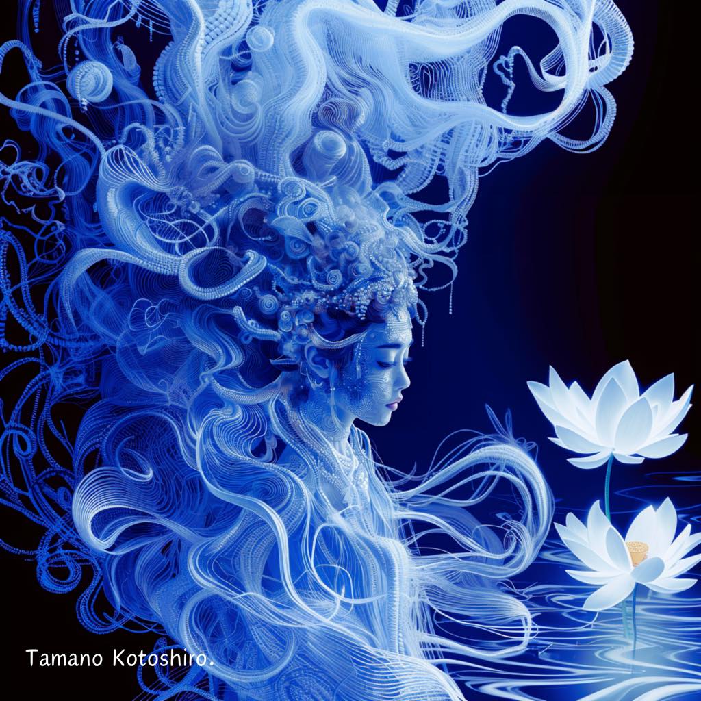 このアートは「蒼の記憶」と題し、水の女神が静かに祈りを捧げる姿を通して、私たちが忘れかけた魂の記憶を呼び覚ますことを意図しています。