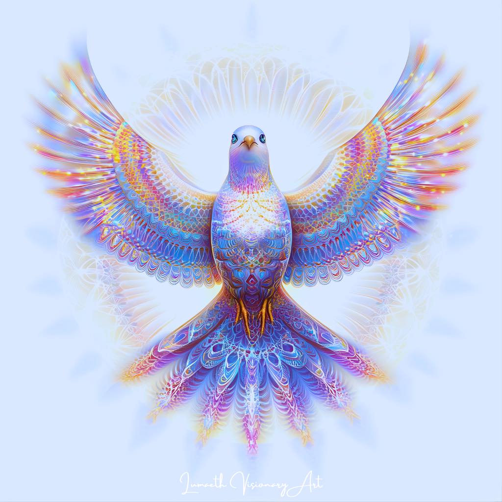The radiant dove carries the breath of peace and celestial blessing.