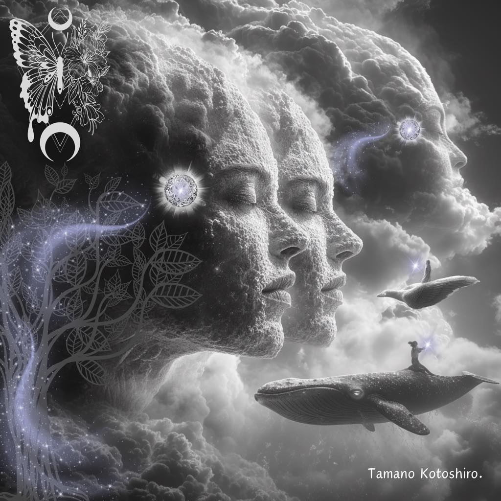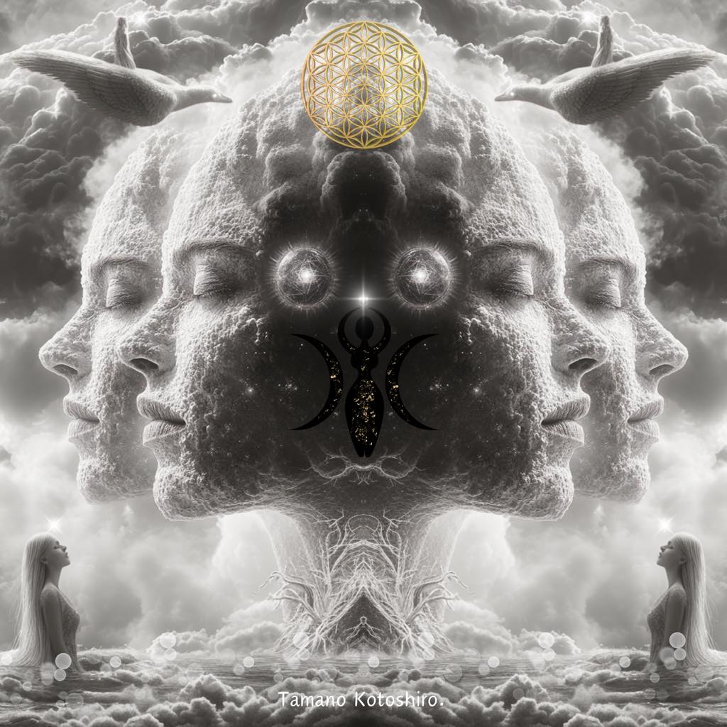 この作品は、想像という聖なる力が次元を超えて世界を創り出していく“魂の旅”を表しています。