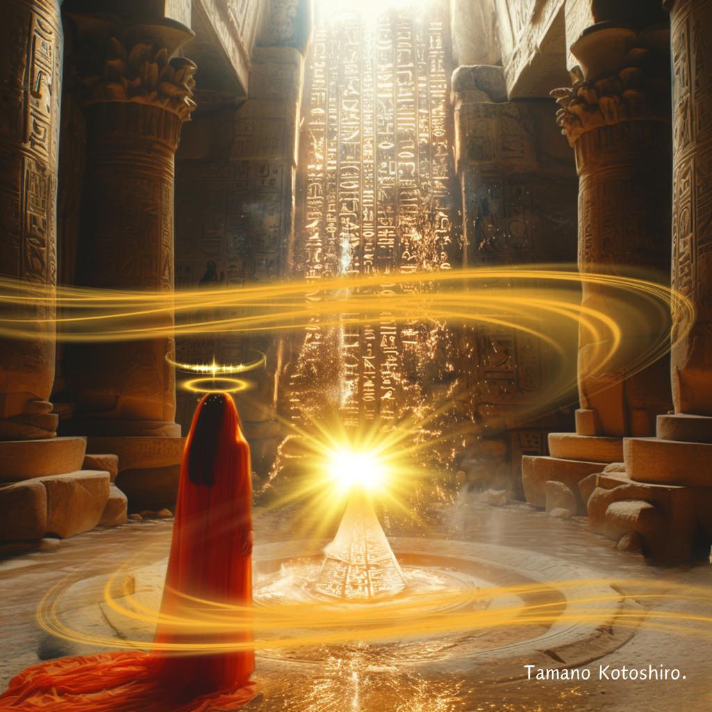 光の柱は天と地を結び、中央のピラミッドは神聖なゲートとして開かれる。