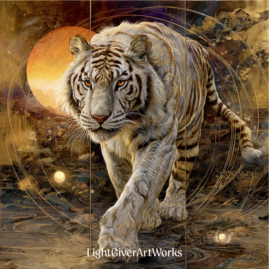 この作品シリーズでは 日本の伝統的な金箔屏風の美学と 現代のスピリチュアルアートが融合