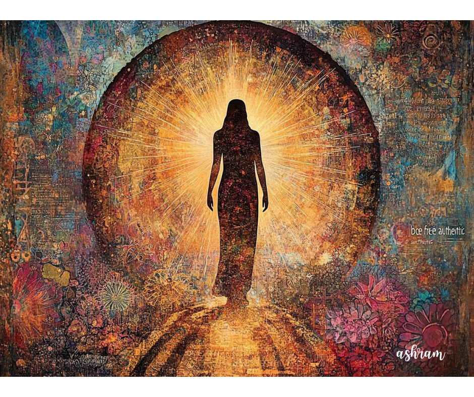 実現の段階 – The Stage of Manifestation 光を受け取った。 門をくぐった。 そして今 何者であるか? この人物はもう ひざまずいていない。 門の前に立っていない。 堂々と 前を向いて 立っている。 そして光は 外から来ていない。 自分自身から放射している。 あなたは今、太陽。 周りには花々が咲き誇り 自然が祝福している。 背景のコラージュは あなたの人生そのもの。 読んだ本、出会った人 経験したこと、感じた感情 すべてが重なり合って 今のあなたを創っている。 無駄な経験は一つもなかった。 Be Free Authentic 自由に、本物として、存在せよ。 もう誰かの期待に応える必要はない。 もう型にはまる必要はない。 ただ、あなたであればいい。 それが最も美しい。 影も、傷も、弱さも すべて含めてあなた。 すべて含めて完璧。 旅は完結した。 新しい人生が始まる。