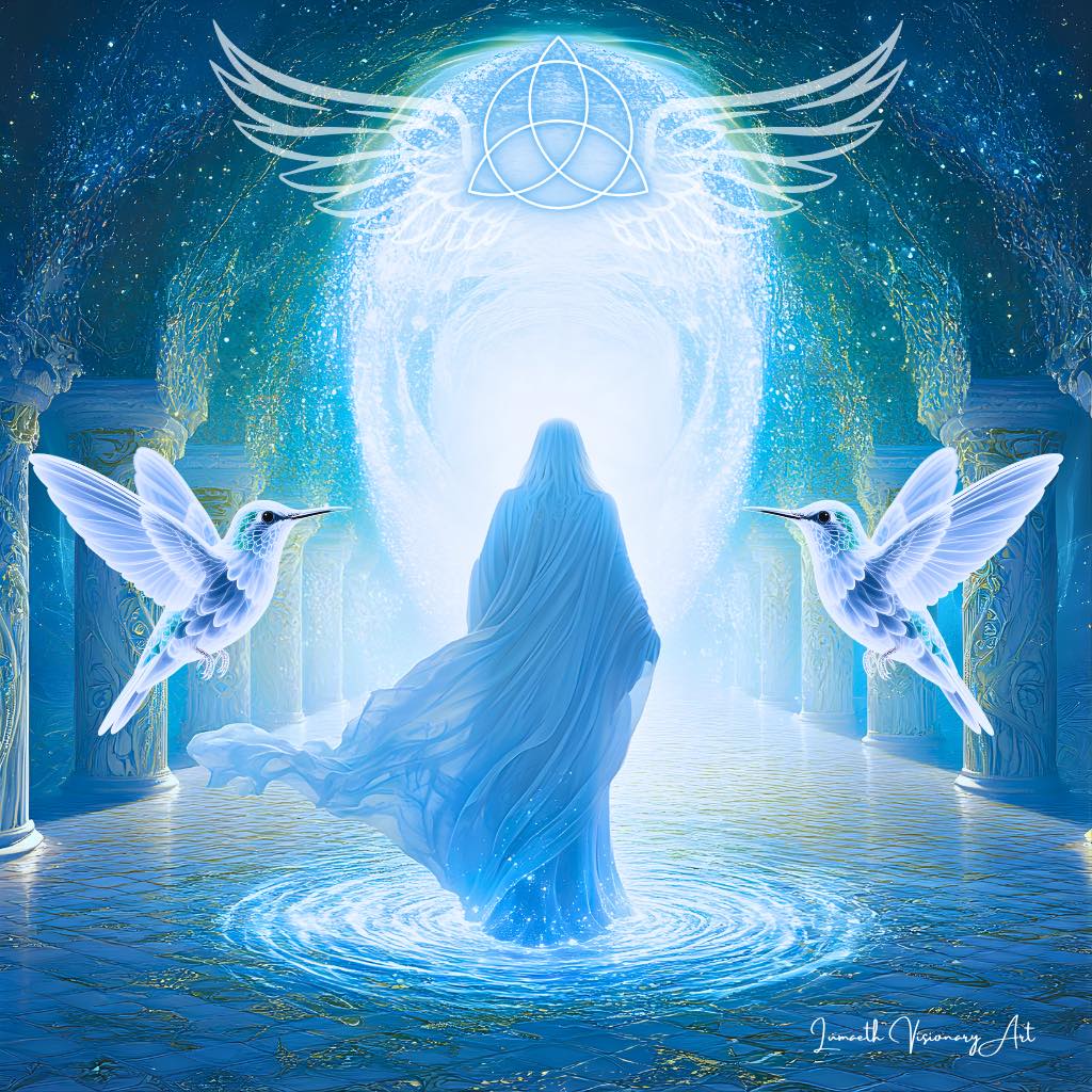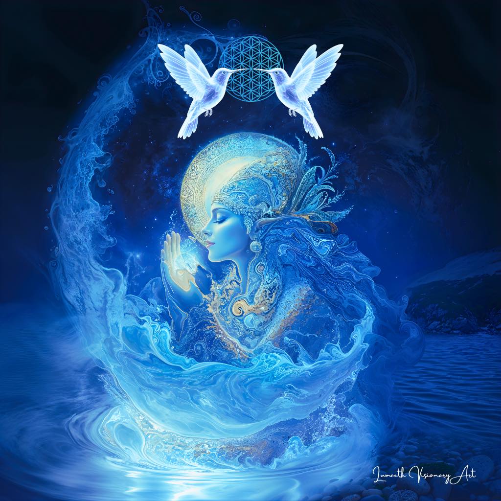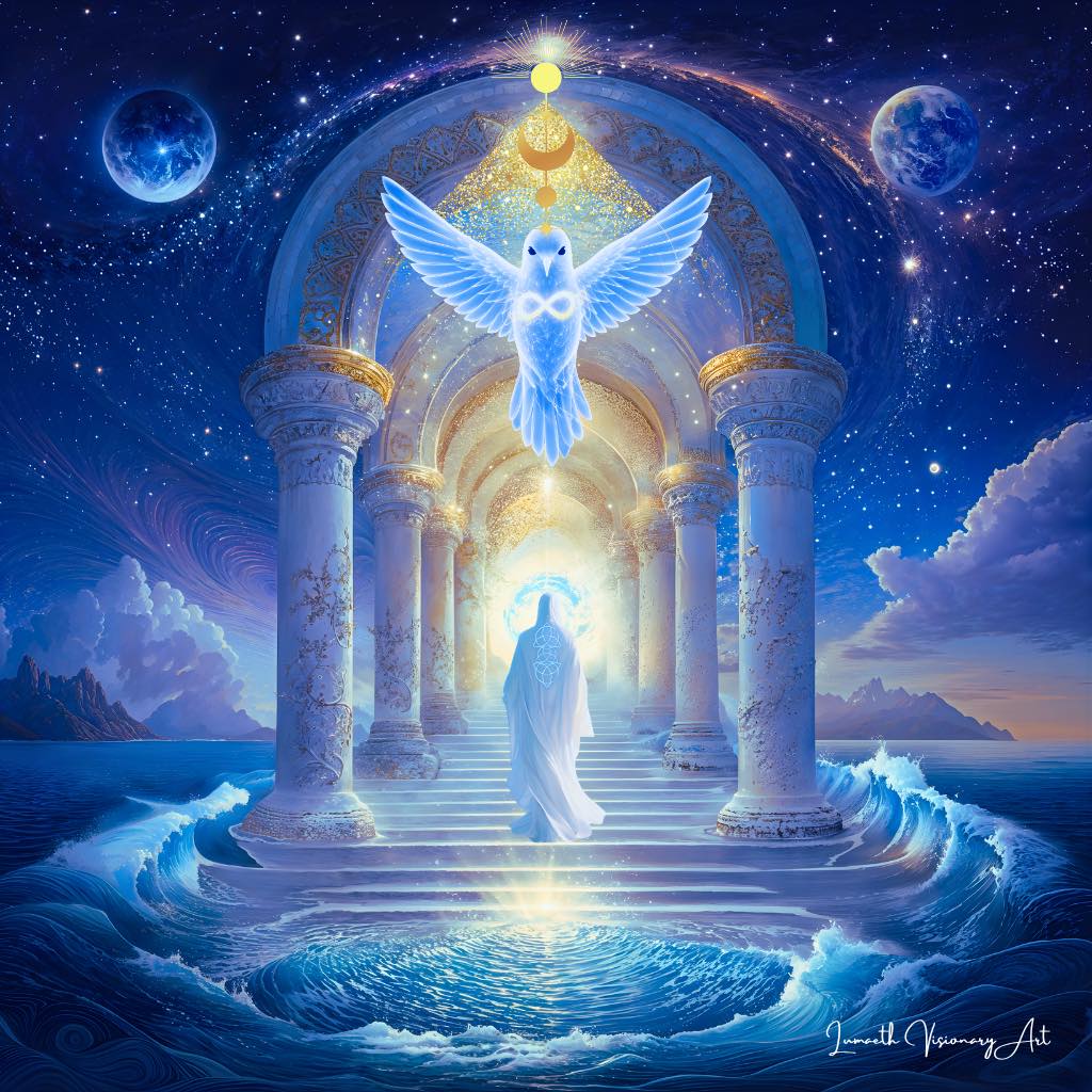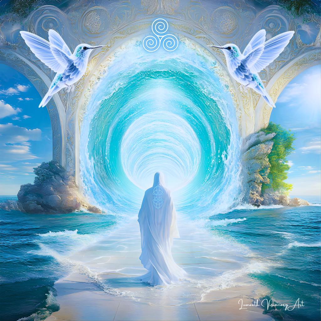 光はいつも内側で満ちている。 その静けさに触れたとき、魂は自らの源へと還りはじめる。 揺らぐ水の門は、いまこの瞬間へと続く扉。 足を踏み入れるたびに、記憶はほどけ、存在は澄みわたっていく。 これは… あなた自身がすでに放っている波紋。 その波に身をゆだねたとき、