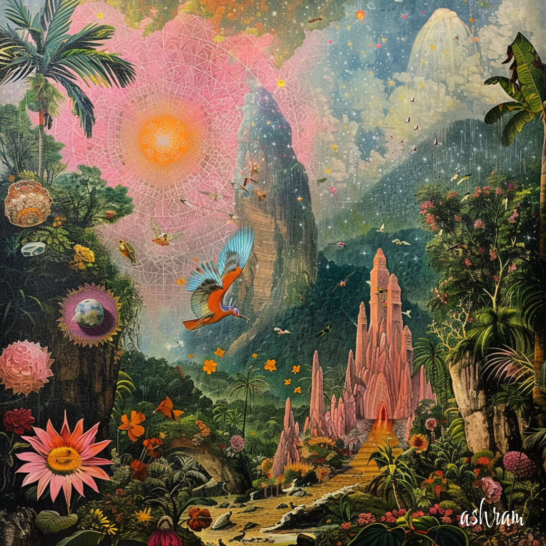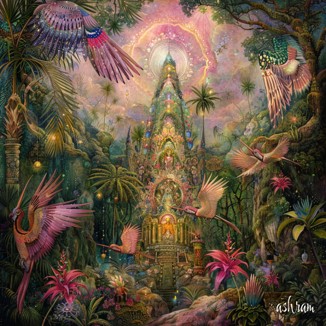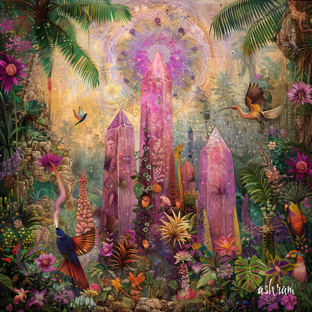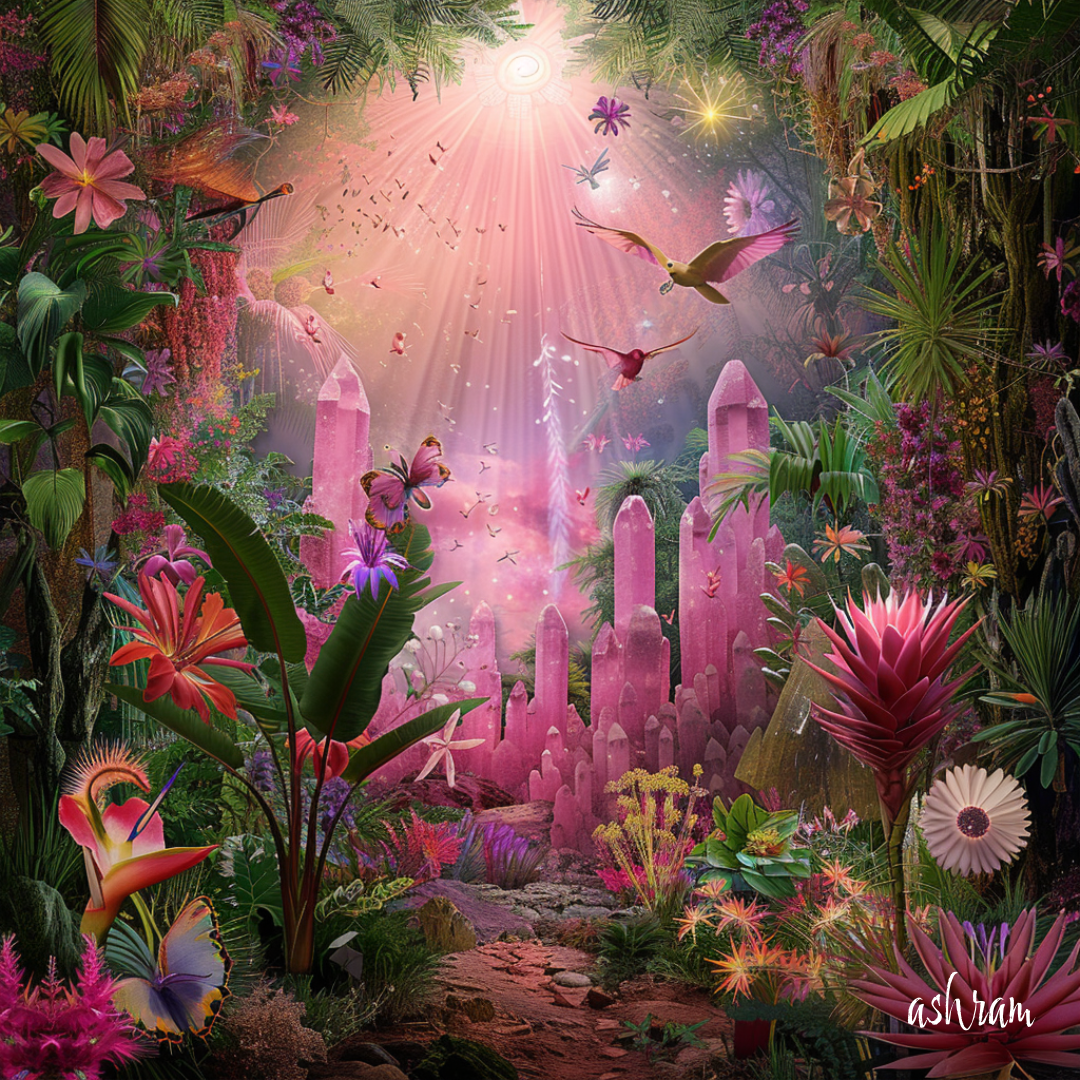 熱帯の森の奥深く、ピンクの光が降り注ぐ場所に、 水晶の柱が立ち並び、魂を浄化する聖域への入り口が開かれています。
