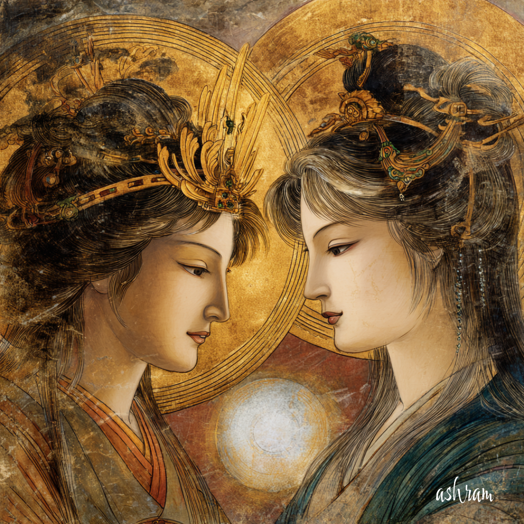 見つめ合う眼差しの中に宿るのは、時を超えた魂の対話。 分断された神話を再び繋ぎ、真実の愛と調和を取り戻そうとする祈りが込められています。
