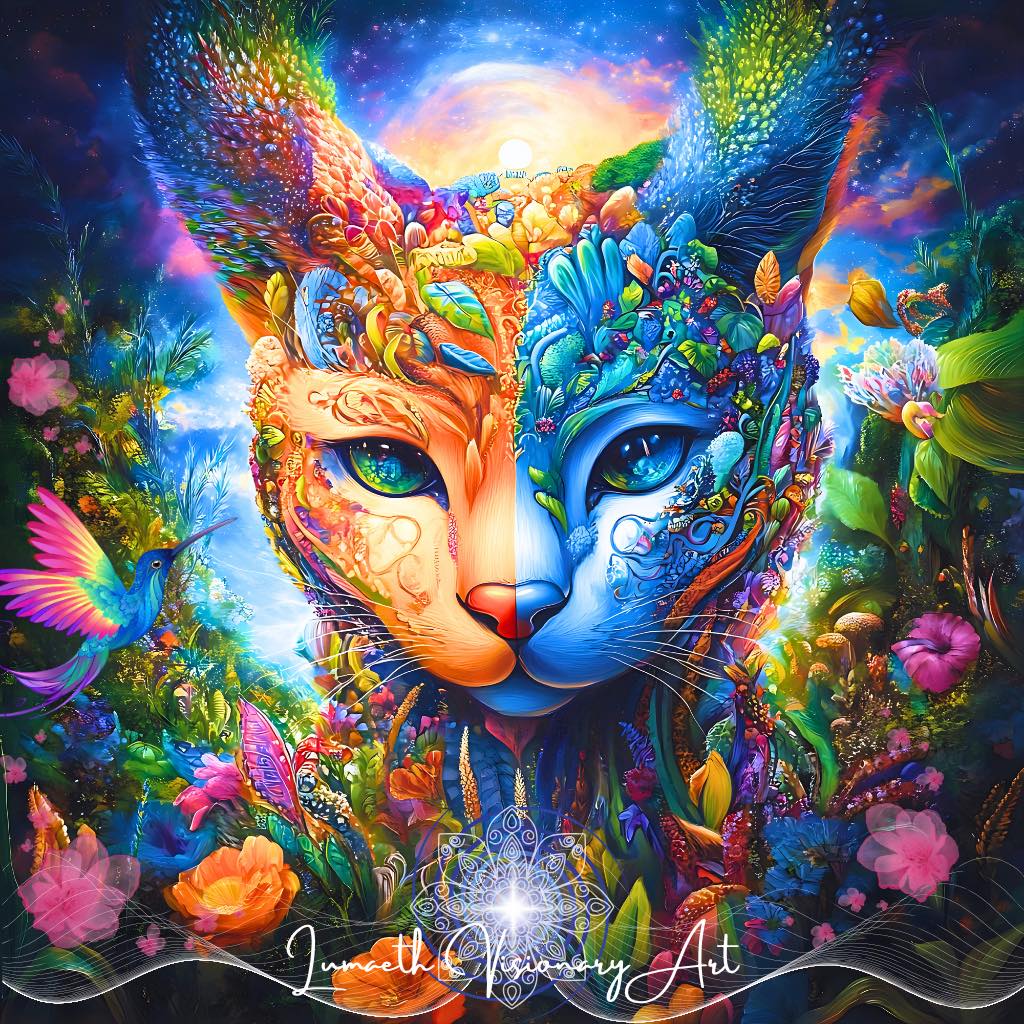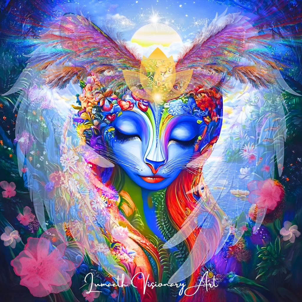 森の声を聴き、風と語らう猫。 その瞳は、すべての生命の色を映し出す鏡。 彼(彼女)は境界を越え、花と光と夢の世界をひとつに繋ぐ“シャーマン”。 翼を広げるたび、大地と宇宙のリズムがあなたの中で共鳴し、眠っていた“創造の本能”が目を覚ます。 ~あなたの魂にも、虹の翼がある~ それは自由に生きるという祈りの形。