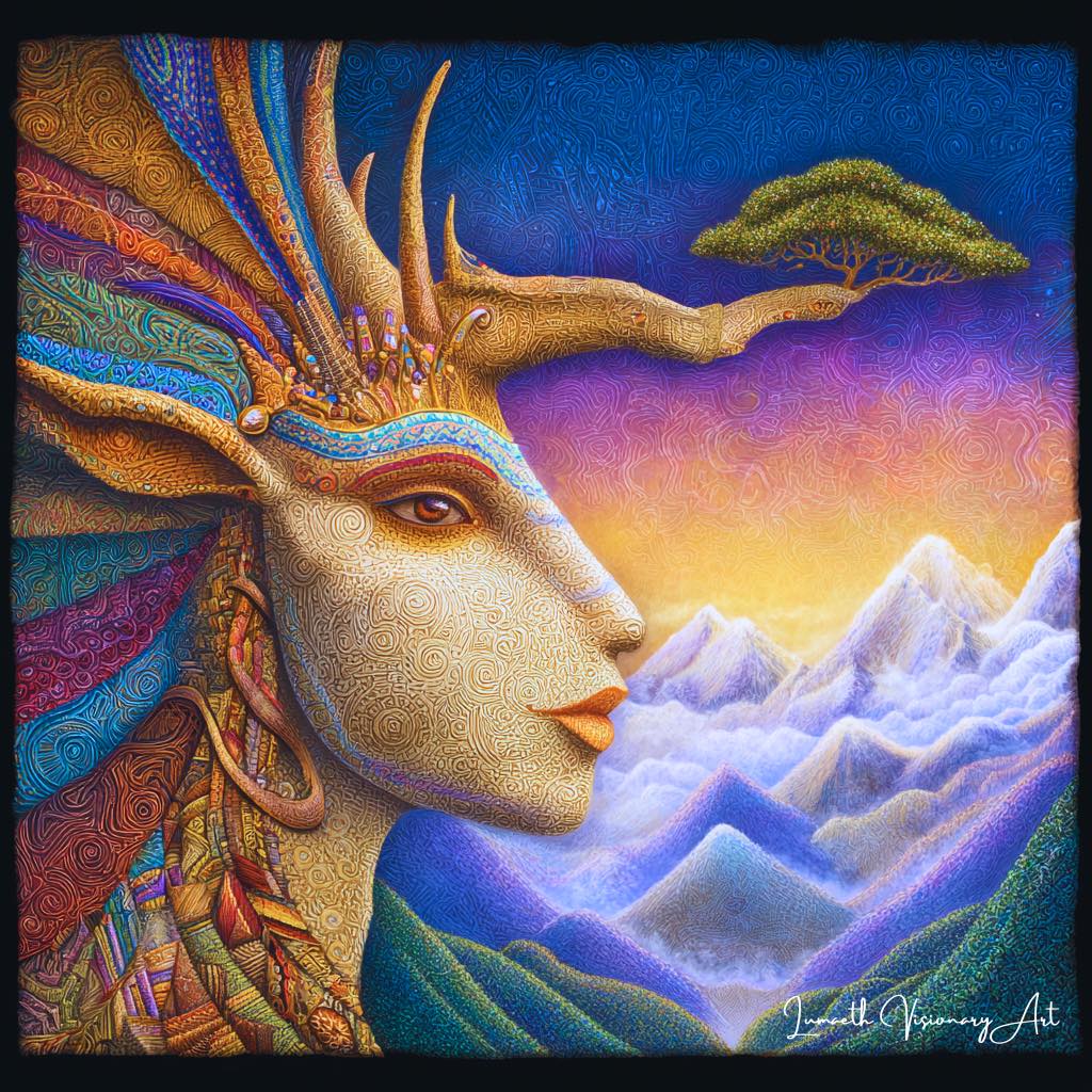 古(いにしえ)の空が 瑠璃に染まるとき 母なる嶺は 静かに目を開く。 枝張る角は 雲を分け 渦巻く肌は 大地の記憶 その瞳に映るは 巡る季節と 小さき命の ささやきのみ。 「登りゆく者よ 恐れるなかれ お前の足跡は 山の紋様となり お前の吐息は 霧となって やがて深い森を 潤すだろう」 高く、気高く、悠久の風を抱き 彼女は今日も 頂(いただき)から この世界を 愛(め)で続ける。