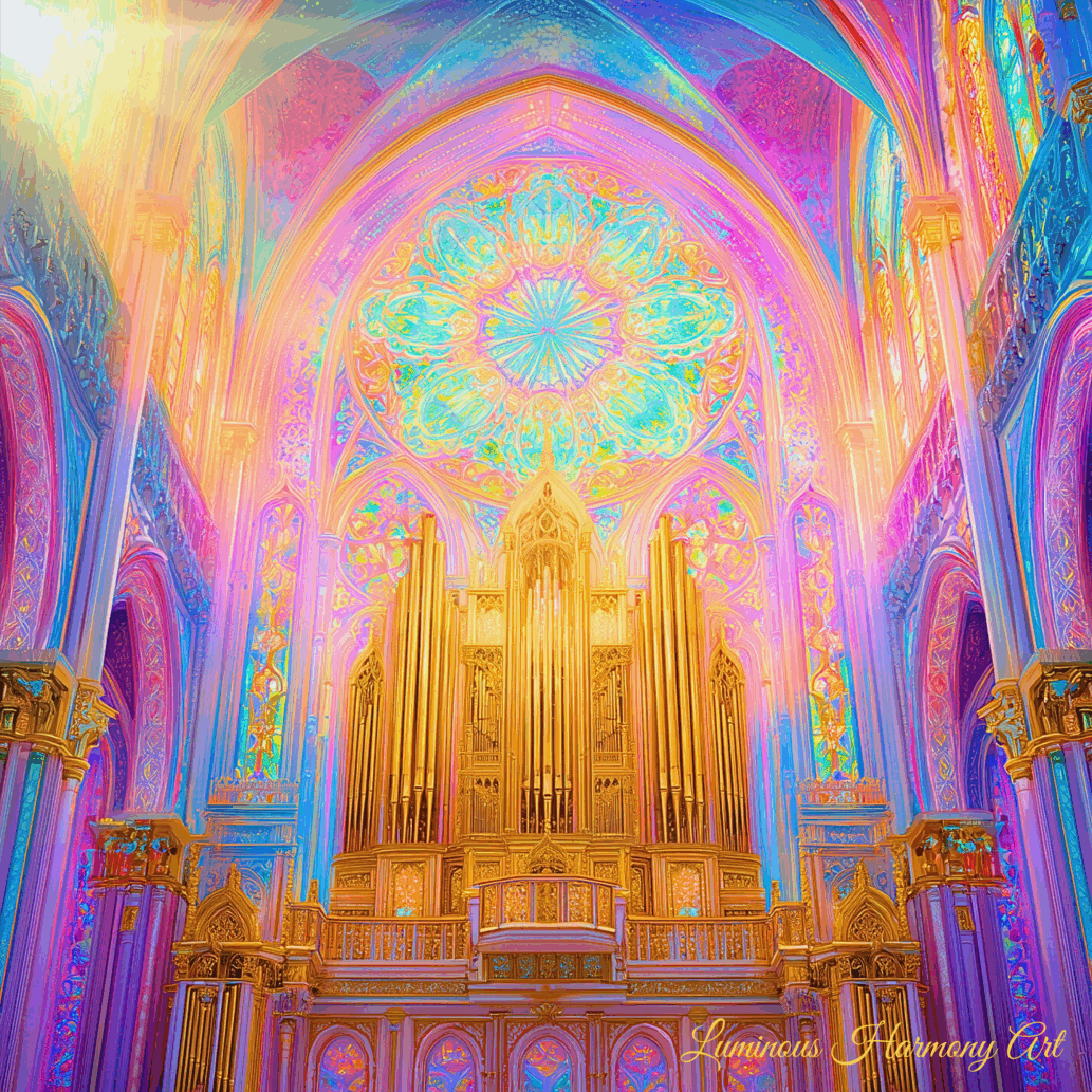 The Cathedral Where Harmony Resonates portrays this layered relationship of light sound and architecture as a single quiet scene