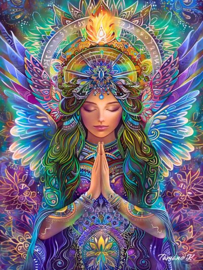舞い散る光と花々は、神と人との対話のように大地に響き、すべての命を調和へと導くエネルギーを象徴しています。