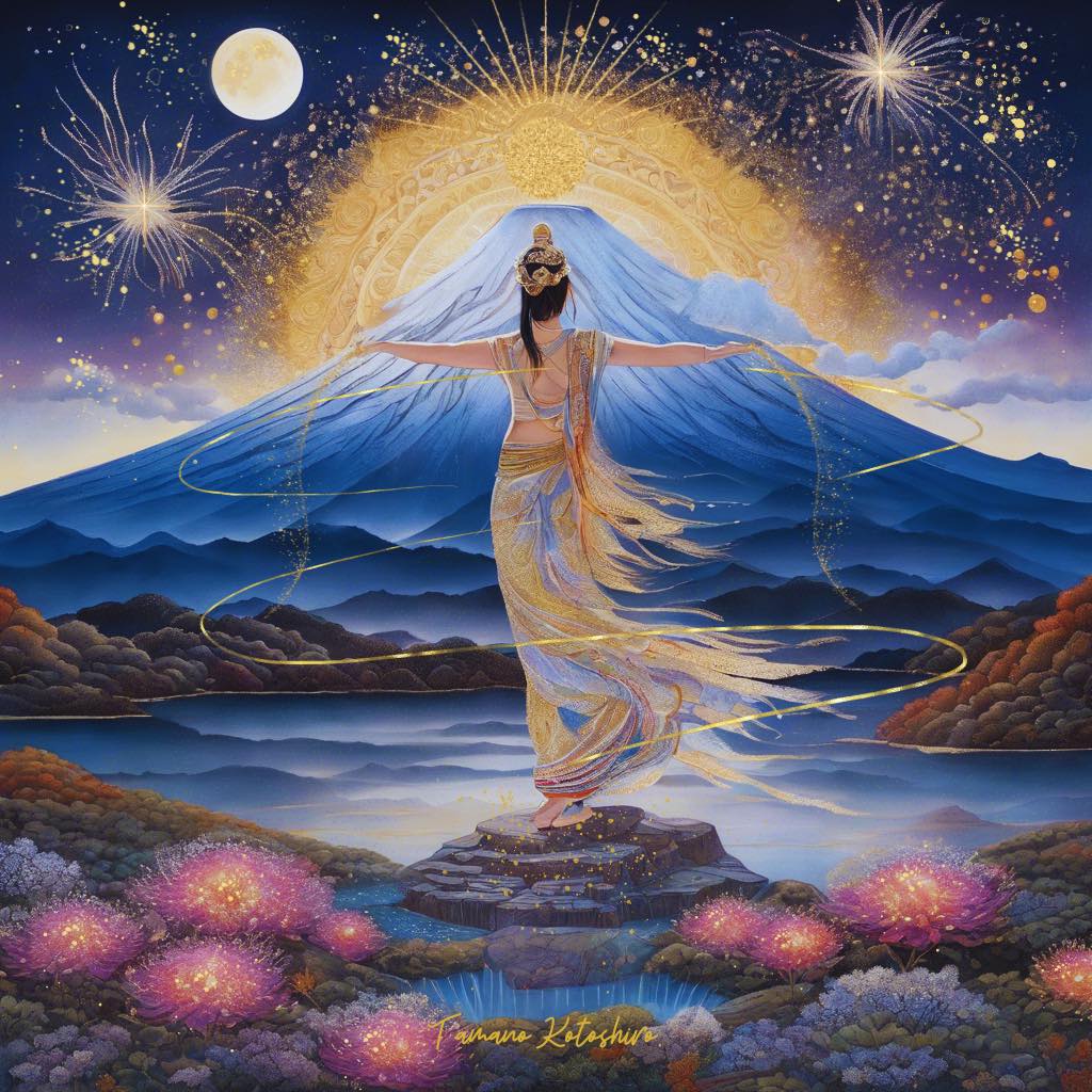 天を仰ぎ舞う女神の姿は、古代から続く神楽の魂を映し出し、満月と太陽の光に抱かれる富士は、天地を結ぶ聖なる柱として輝いています。