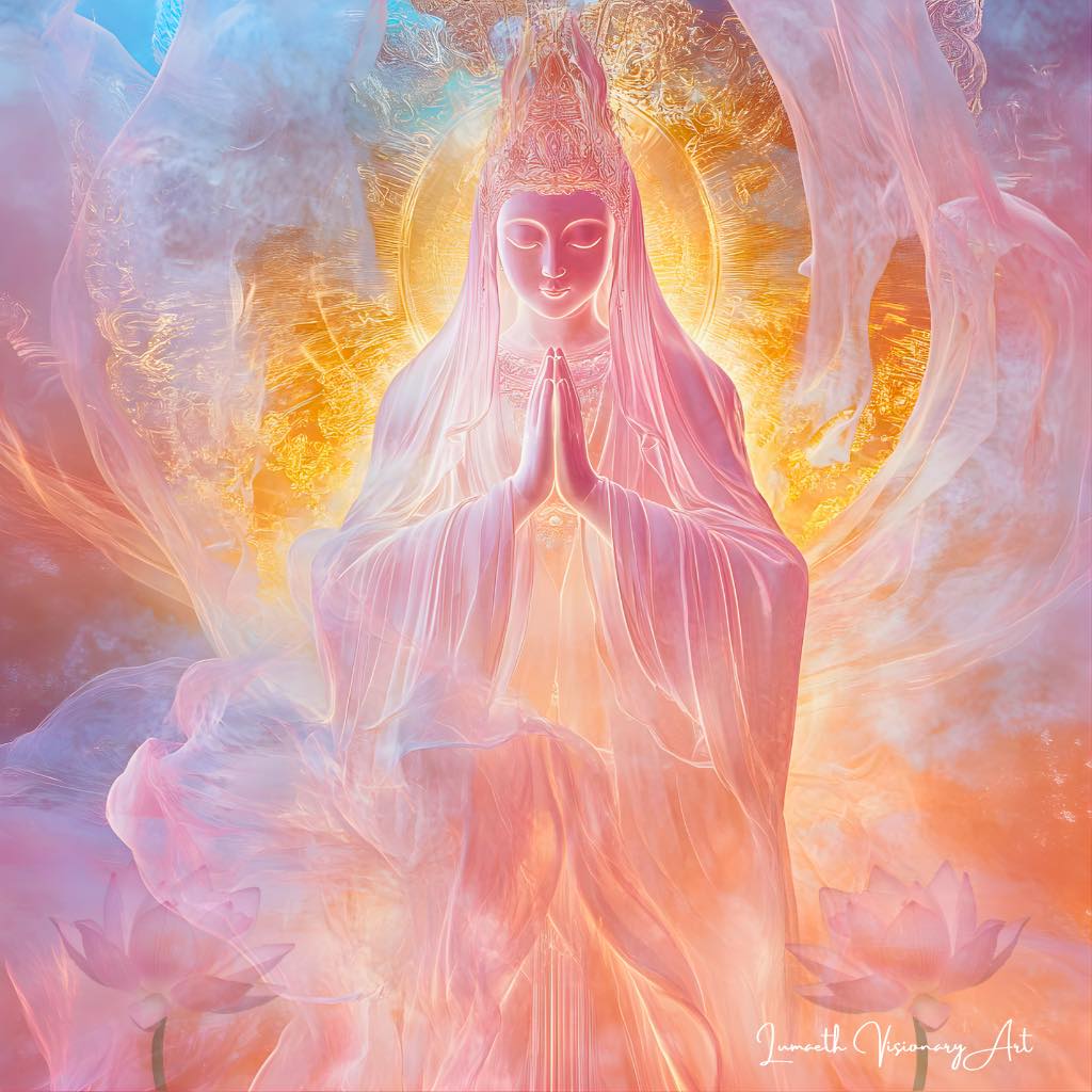 東の慈悲と、西の母なる愛が、 ひとつの光として結ばれるとき、 その波動は境界を越えて、深く静かに広がっていく。 その光は、すべてを包み込み、 すべてをゆるし、ただ在ることそのものを祝福している。 胸の奥に触れたそのやわらかな輝きは、 あなたの内に眠る神聖な記憶を、そっと目覚めさせていく。