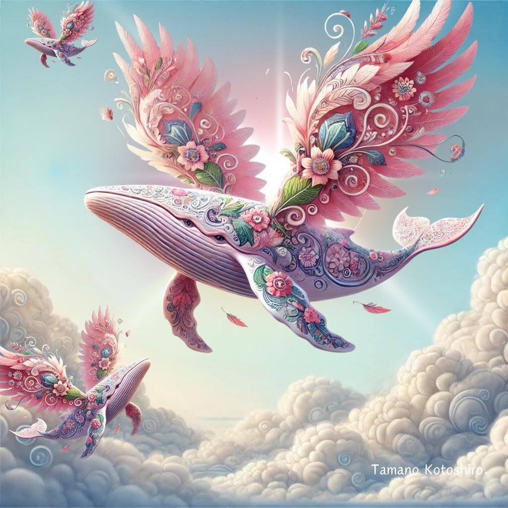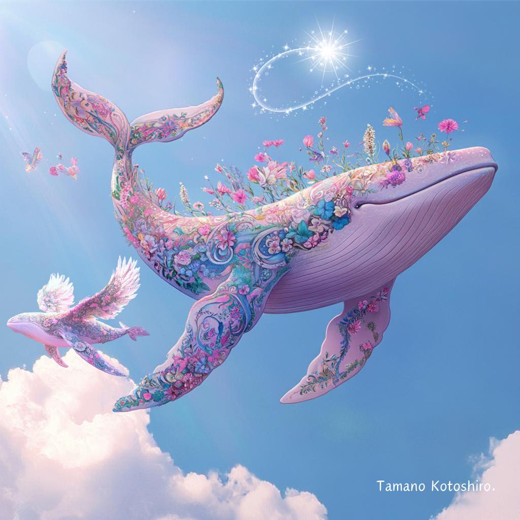 花くじらは、愛と生命の調和を象徴する存在。海を離れ、天を泳ぐその姿は、「自由」「再生」「祈り」のエネルギーを運んでいます。