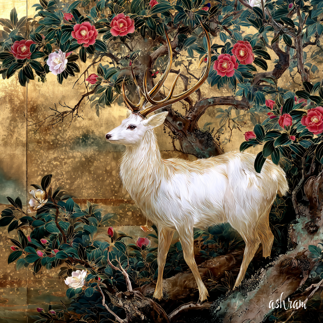 金箔の屏風絵の中で、白鹿は椿の花に囲まれて優雅に佇む。金色の角は天界とのつながりを象徴し、白い毛並みは純潔と神聖さを表現する。椿の紅は生命の情熱と愛の顕現、緑の葉は永遠の生命力。この東洋美術の伝統と融合した作品は、日本の美意識とスピリチュアリティを統合し、「聖なる優雅さと天界からの祝福」を伝えている。白鹿は森の守護者であり、見る者の魂に静謐な気品と神聖な愛をもたらす。