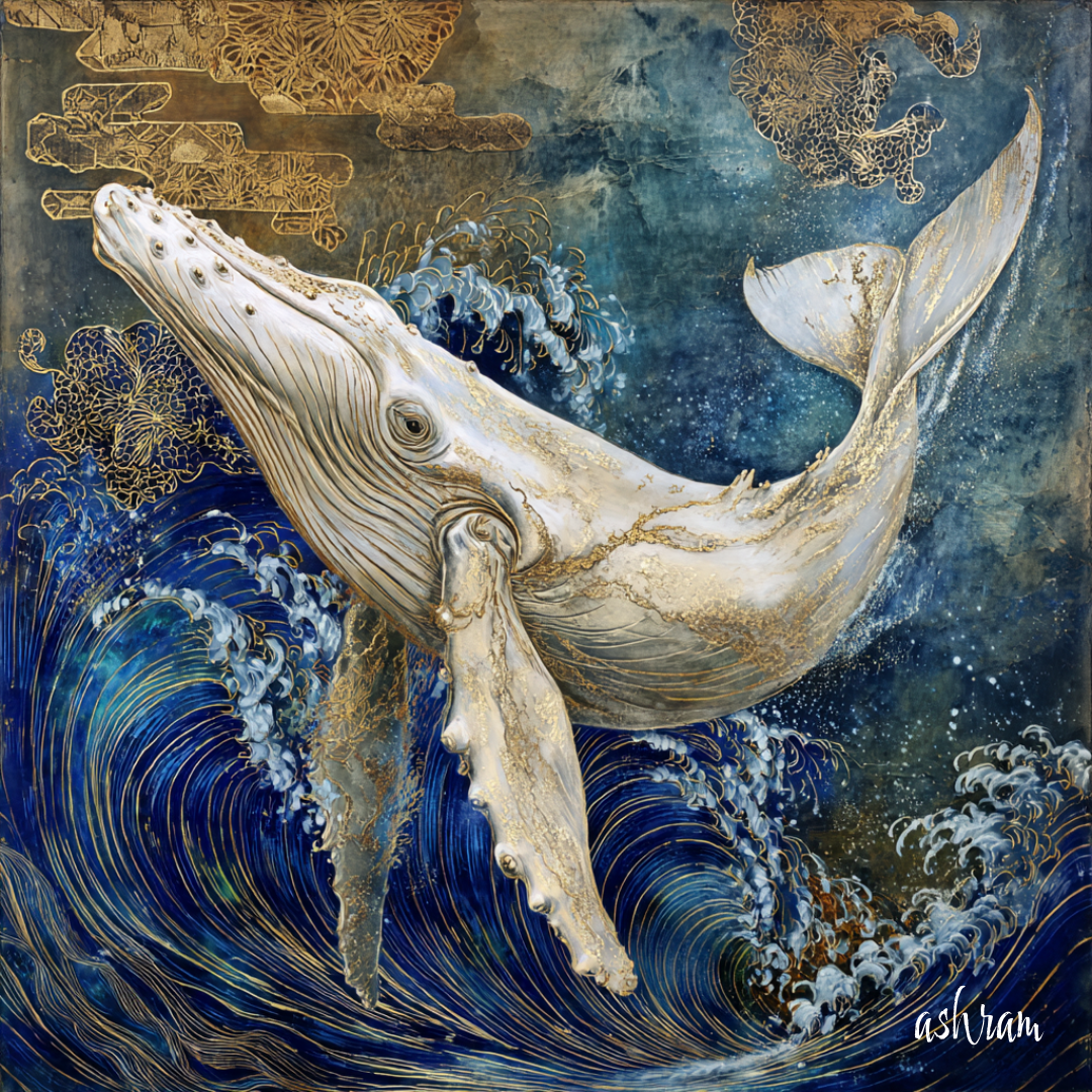 深海の青と黄金の波が融合する聖なる空間で、白鯨は力強く生命の躍動を表現する。波の一筋一筋に込められた金の線は、宇宙の叡智と生命のエネルギーの流れ。白鯨は深い感情と古の記憶の守護者であり、その巨大な存在は母なる地球の慈愛そのもの。東洋的な雲の文様は天と海の境界を越えた次元の融合を示し、この作品は「深淵からの祝福と生命への讃歌」を歌い上げている。