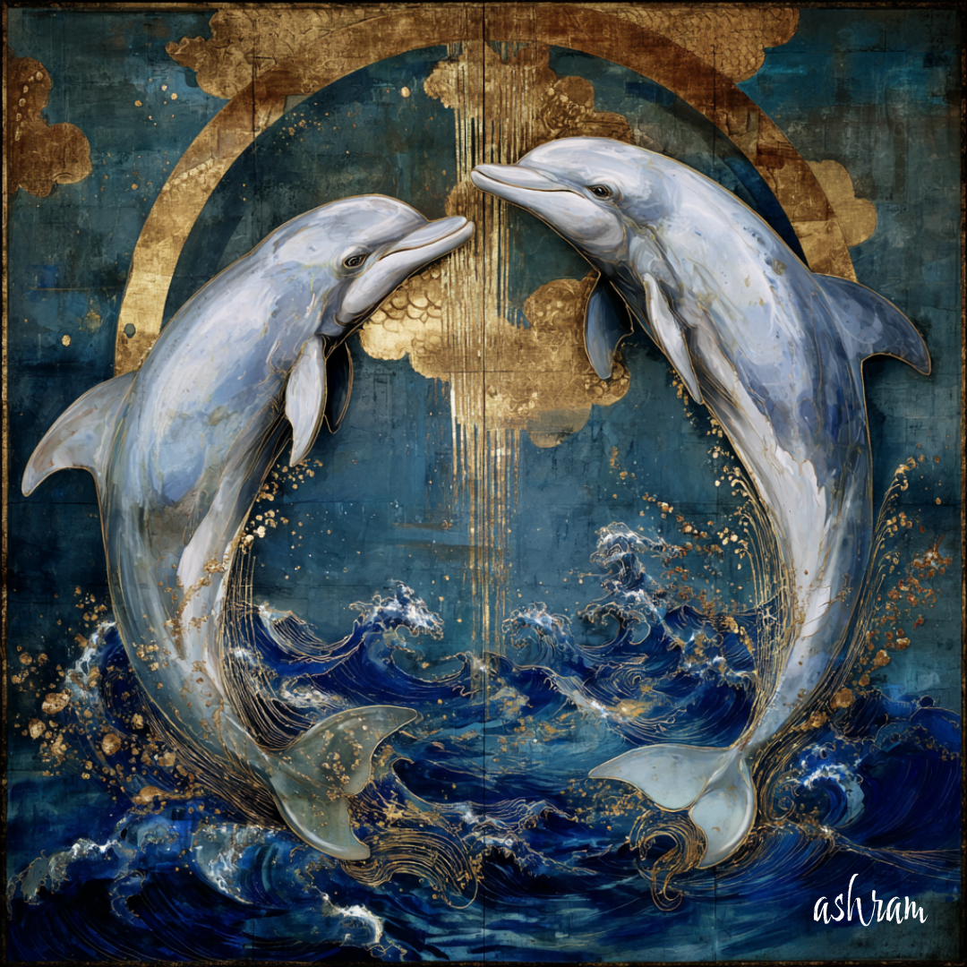 青と金が織りなす円環の中で、二頭のイルカが生命の水を躍動させる。波しぶきと黄金の粒子は、喜びと愛のエネルギーが物質界に顕現する瞬間を描く。イルカは知性と遊び心、そして高次元とのコミュニケーションの象徴。円環は宇宙の完全性と永遠の循環を表し、二頭の調和は陰陽の統合を意味する。この作品は「魂の喜びと宇宙との調和」を呼び覚まし、見る者の心に愛の周波数を届ける。
